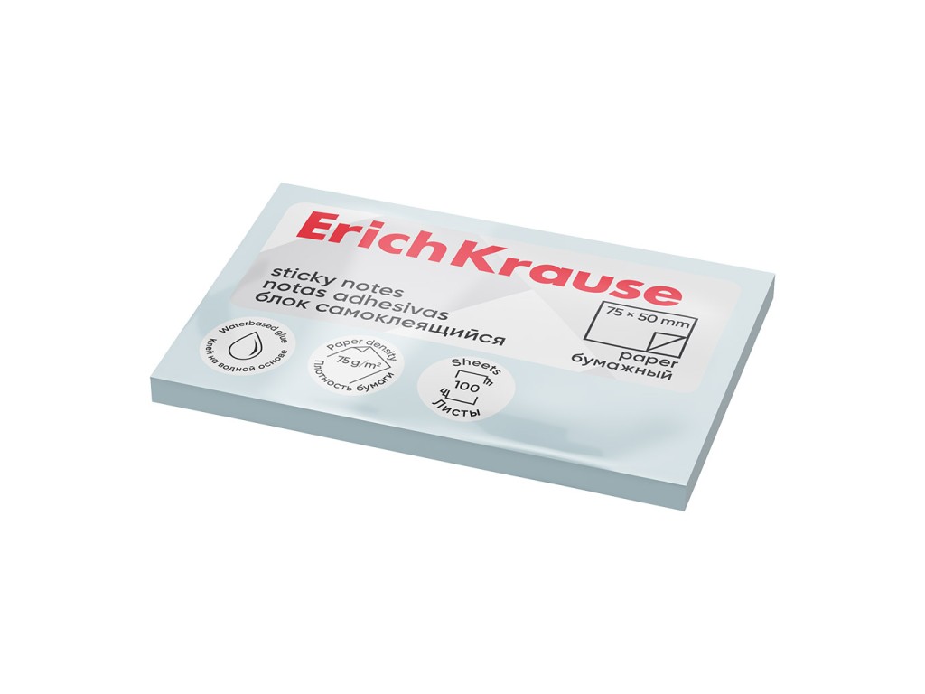 Блок самоклеящийся бумажный ErichKrause 75х50 мм, 100 листов, голубой