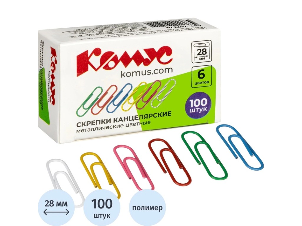 Скрепки 28 мм Комус с полимерн.покрыт разноцветн,100 шт
