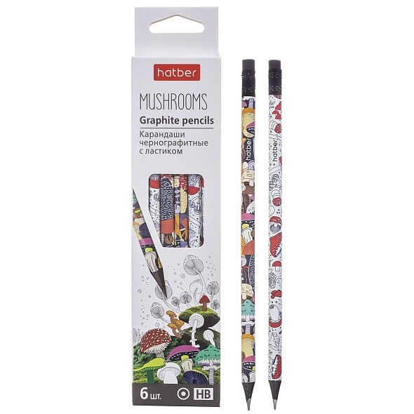 Карандаш ч/г Hatber Mushrooms набор 6шт круглый черн.дерево HB с ластиком Ассорти