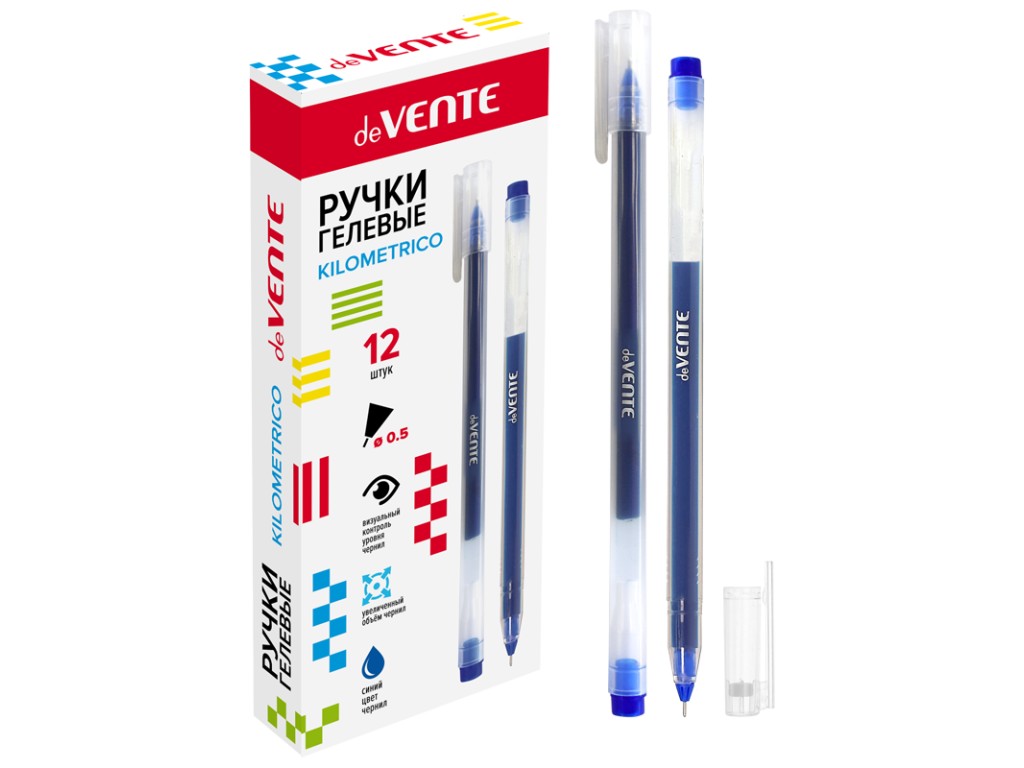 Ручка гелевая deVENTE Kilometrico 5 мм, синяя УВЕЛИЧЕННЫЙ объём чернил, длина 1200 м, прозрачный ко