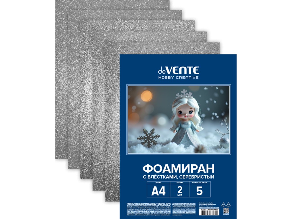 Фоамиран серебристый с блёстками A4 "deVENTE. HOBBY CREATIVE" 5 л, толщина 2 мм, пластиковый пакет с европодвесом