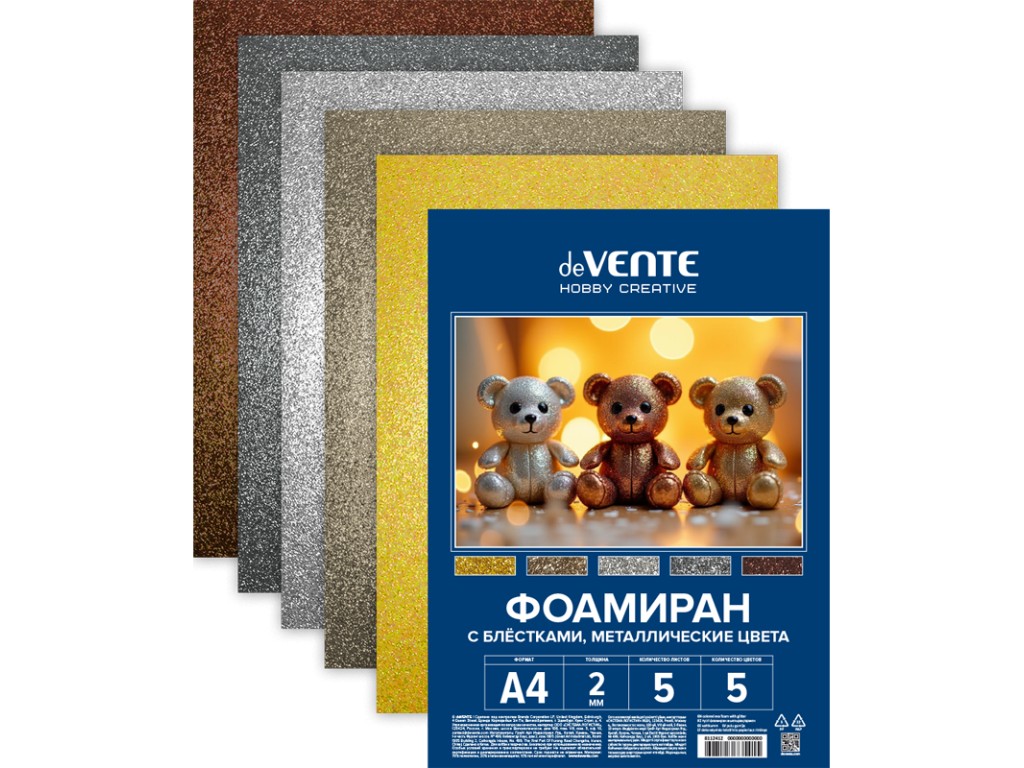Фоамиран цветной с блёстками A4 "deVENTE. HOBBY CREATIVE. Металлические цвета" 5 цв, 5 л, толщина 2 мм, пластиковый пакет с европодвесом