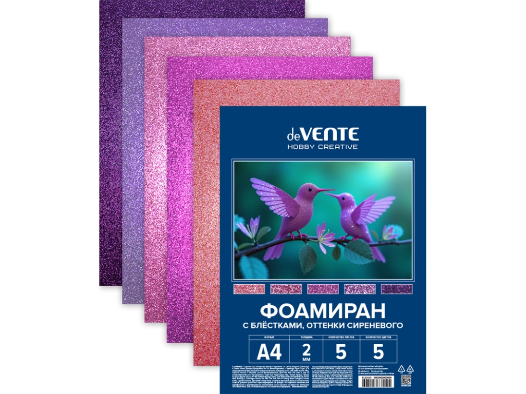 Фоамиран цветной с блёстками A4 "deVENTE. HOBBY CREATIVE. Оттенки сиреневого" 5 цв, 5 л, толщина 2 мм, пластиковый пакет с европодвесом