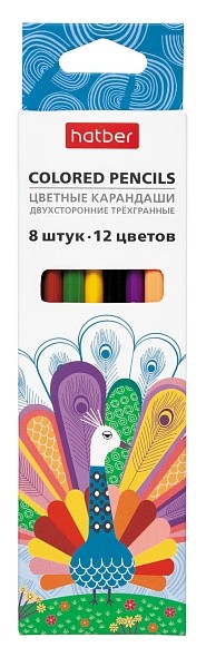 Карандаши 12цв/ 4+4шт=12 Hatber двухсторонние трехгран.корпус с заточ. в карт.короб. с европодв